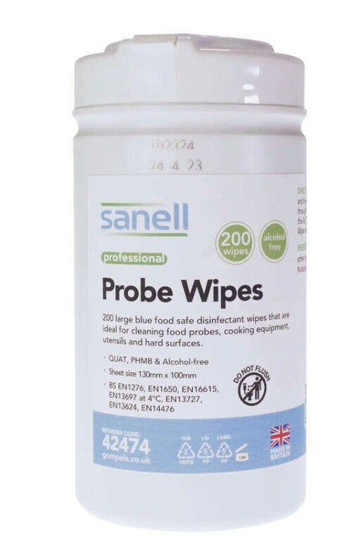 This tub of 200 large blue food safe Probe Wipes is the perfect disinfectant for use in the kitchen environment. They are ideal for cleaning food temperature probes, cooking utensils and hard surfaces such as chopping boards. Each one is alcohol free, QUAT and PHMB free. Each sheet is dispensed singly from the tub.